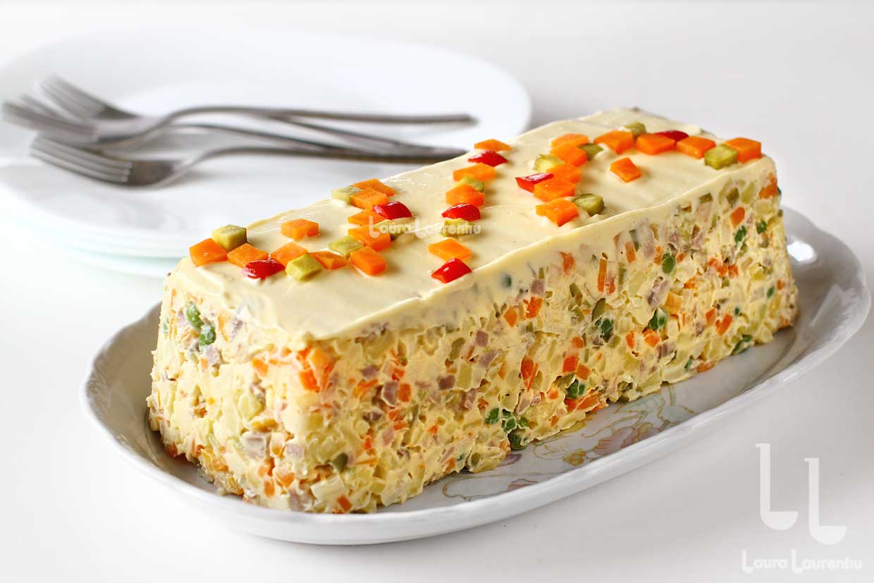 3. Am decorat doar partea superioară a salatei cu o peliculă subțire de maioneză. Deasupra acesteia am aranjat bucățele de morcov, castraveciori în oțet și gogoșari, decupate într-o formă aproximativ pătrată. Decorul stilizat pe care l-am făcut am dorit să sugereze un motiv popular românesc. Am urmărit acest stil în ideea că salata aceasta este atât de iubită în România.