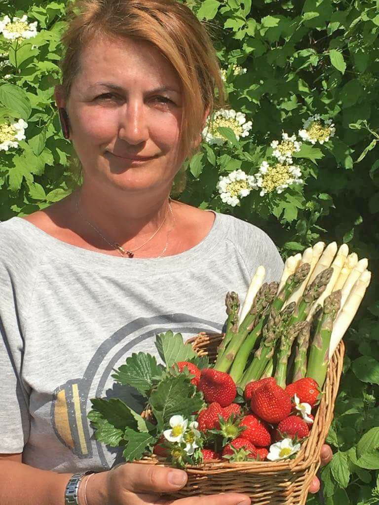 Ei bine, mulțumită Violetei, din sparanghel a gustat cu încântare atât bunicul meu, cât și noi și fata noastră. În plus, e și cultivat de fermiera vrednică pe care o puteți vedea în poza ce urmează. Nu e ”o poză profi”, s-a scuzat Violeta, dar ea nu are timp să plece din fermă în căutarea unui fotograf. Nu-i nimic, ne mulțumim cu o poză sinceră, chiar dacă e făcută cu telefonul.