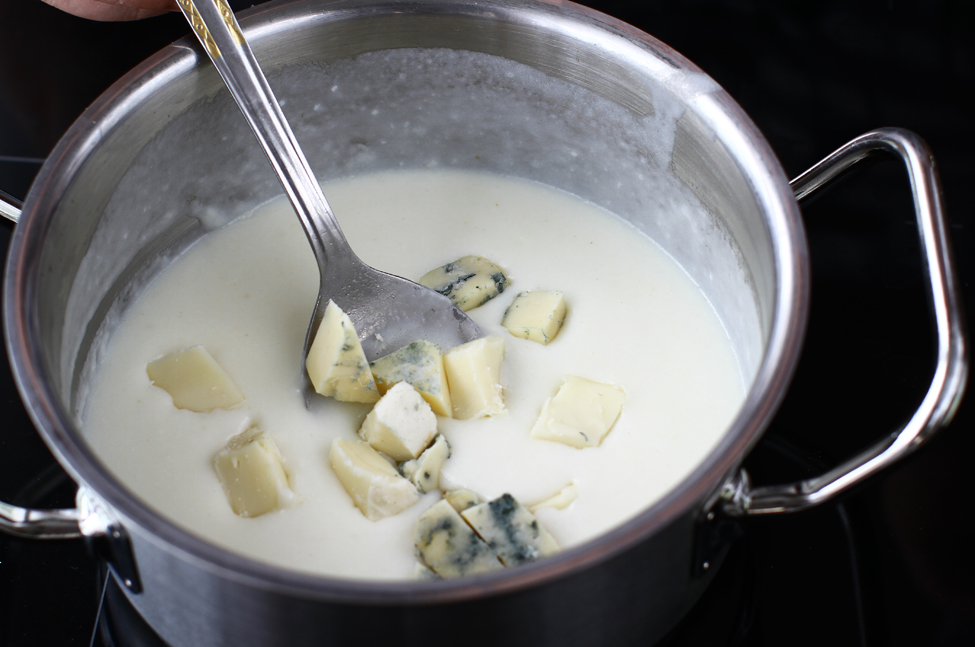 7. După ce sosul a fiert și s-a îngroșat, adăugăm brânza cu mucegai în bucățele și amestecăm până se topește. După ce brânza s-a încorporat în sos, lăsăm sosul să se răcorească puțin, acoperit cu folie alimentară. După aceea, vom adăuga pe rând și cele două ouă întregi, amestecând până la omogenizare. Asezonăm cu sare și piper alb și sosul de bază este gata.