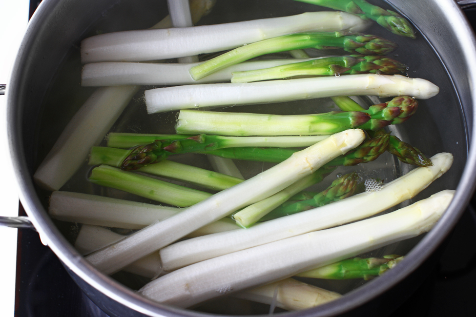 Trebuie să știți că sparanghelul alb trebuie decojit cu un peeler special pentru legume de coaja de la suprafață, pe toată lungimea tulpinii, exceptând vreo 5-6 cm chiar la vârf. Coaja sparanghelului alb trebuie îndepărtată pentru că e ușor amăruie. Sparanghelul verde, în schimb, nu e necesar să se curețe de coajă, o faceți doar dacă doriți.