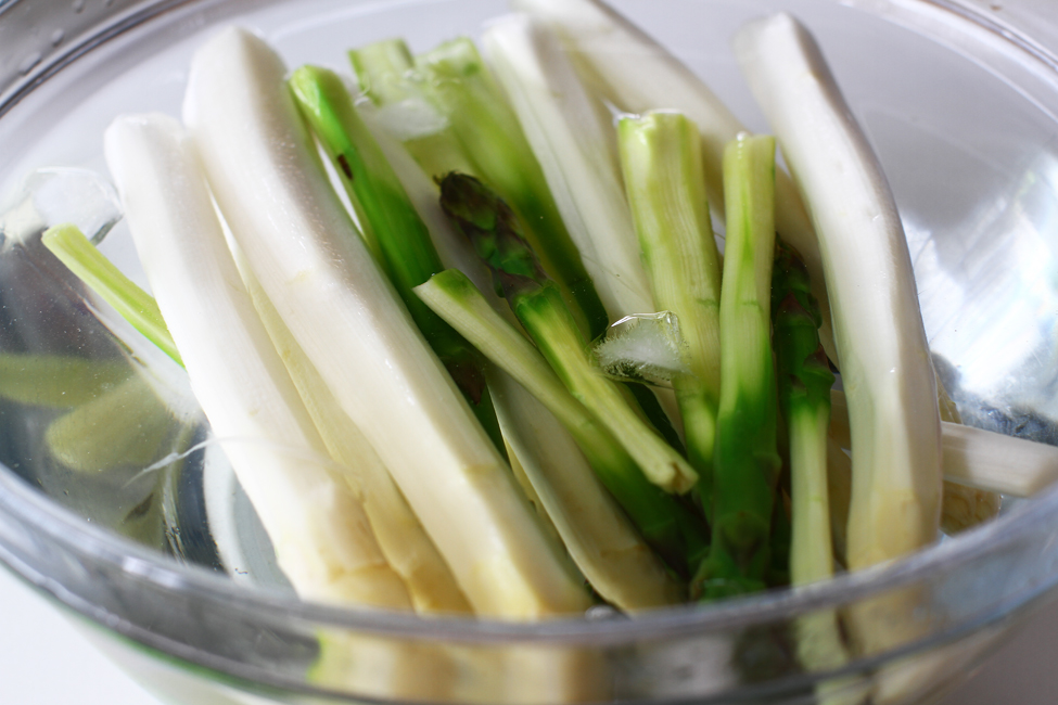 3. După 1-2 minute scoatem sparanghelul cu o spumieră și-l trecem imediat în castronul cu apă cu gheață. Această operație se numește blanșare (vezi explicația DEX) și are rolul de a păstra o culoare și o textură optimă a legumelor. Această culoare vie se va păstra și dacă vom continua să le gătim până la 15 minute în continuare. Așa că, după acest șoc termic, vom scurge bine sparanghelul de apa rece și-l vom întoarcem în cea clocotită. Îl vom fierbe în continuare încă 5-7 minute, atât cât să înceapă să se frăgezească. După ce începe să se înmoaie, sparanghelul se scurge bine de apă și se păstrează deoparte.