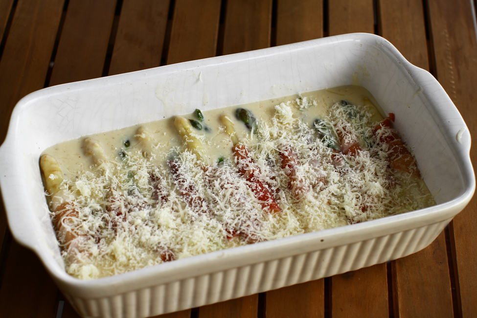 9. Ungem cu unt moale o formă termorezistentă de 30 x 20 cm și turnăm sosul în aceasta, nivelându-l. Aranjăm sparanghelul învelit în șuncă și presărăm pe deasupra cașcavalul ras.