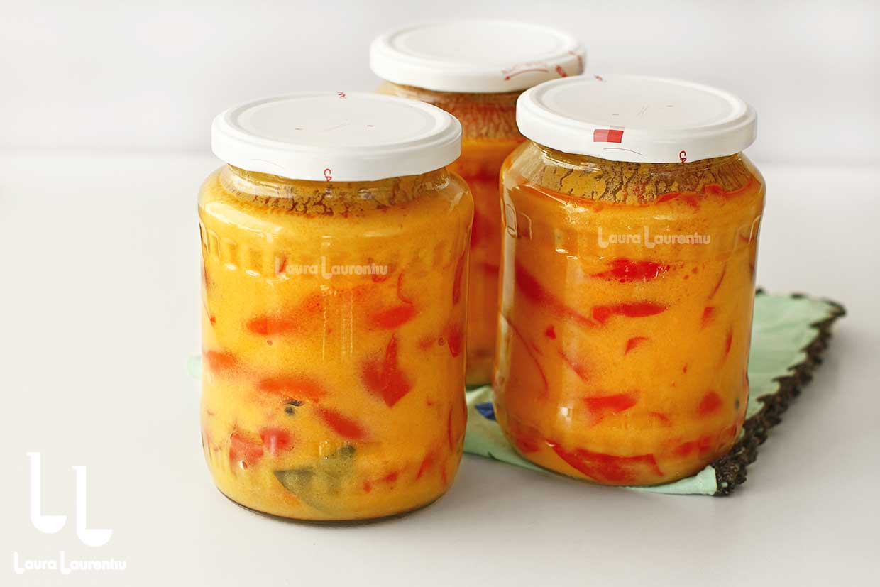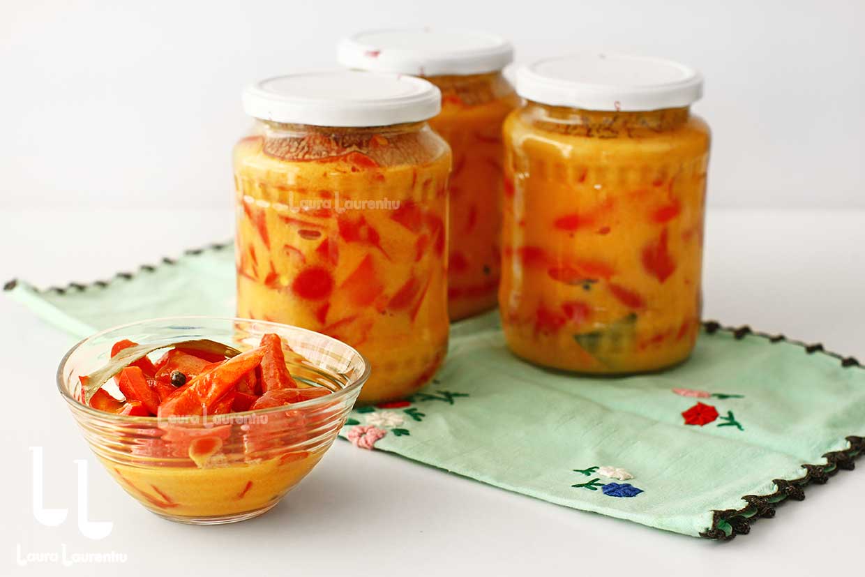 Mi-e destul de greu să definesc rețeta de azi, nu știu unde e mai bine s-o încadrez, pentru că merge atât ca murătură, dar și pe post de mâncare de legume la borcan, cum ar fi zacusca sau ajvarul. Ceea ce știu sigur, însă, este că e absolut delicioasă, mi-a ieșit exact așa cum mi-o aminteam pe a mamei, din copilărie. Am convingerea că o să vă placă și vouă.