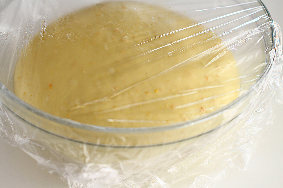 2. Oul se bate cu furculița cu cele 2 gălbenușuri, romul, sarea și zahărul vanilat, până se omogenizează. Se adaugă restul de lapte călduț. Într-un castron mare se pune toată făina. Se face loc la mijloc și se adaugă compoziția de ouă și lapte, apoi drojdia activată și coaja de portocală sau lămâie. Mai comod este să se lucreze cu mixerul sau mașina de pâine, caz în care se adaugă ingredientele în acestea (pentru mașina de pâine, mai întâi lichidele și apoi solidele).