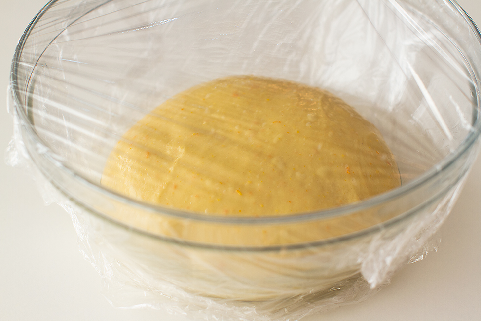 6. Se unge un castron încăpător cu 2-3 picături de ulei. Aluatul se modelează în formă de bilă și se așează în castron. Se înfoliază/se acoperă cu un șervet dublu, ușor umed și se lasă să crească, la temperatura bucătăriei. După 1:30 ore, aluatul meu și-a dublat volumul, ceea ce înseamnă că putem trece la modelarea cozonacilor.