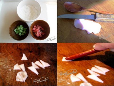 Pentru zambila: Am taiat o felie din pasta, am aplatizat-o si apoi am taiat mici triunghiuri, ca si cum as fi impartit aluatul pentru cornulete, dar la o scara mult mai mica (a treia poza a montajului). In continuare, fiecare bucatica am aplatizat-o pe mijloc cu coada lingurii de lemn (sau alta „scula” rotunjita).