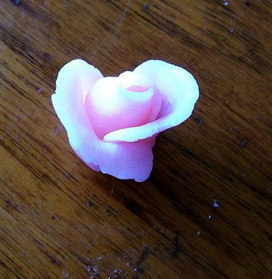 Pentru ca pasta mi-a mai ramas, m-am gandit sa va exemplific si un trandafir, pentru ca mi se pare floarea cel mai simplu de realizat.Pornind tot de la un sul din pasta de modelat cu grosime de aproximativ 1,5-2 cm. Se taie sulul in felii de 1-2 mm. Dintr-una dintre felii modelati un con, in jurul caruia veti atasa petalele florii. In cotinuare, fiecare felie se aplatizeaza, apoi marginile se modeleaza cu un obiect rotunjit (in cazul meu, evident, nu putea fi altul decat lingura de lemn). In jurul conului se infasoara prima petala, acoperindu-l complet (conul nu trebuie sa fie vizibil, are doar rolul de suport). Se continua cu urmatoarea petala, opusa primei, si asa mai departe.