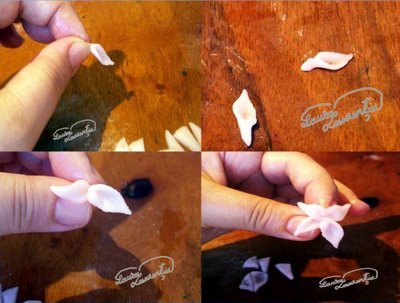 Fiecarei bucatele i-am rasucit una dintre extremitati intre degete, pana am obtinut un fel de „codita” – astfel formand petale. Petalele le-am asezat fata in fata (pe partea adancita) si le-am lipit, mai intai doua, si apoi patru, avand grija sa se pastreze codita, baza florii.