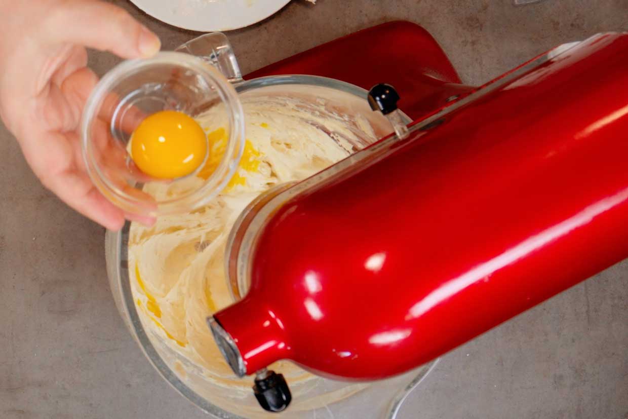 3. Când am obținut crema omogenă dorită, am adăugat, pe rând, în castron, cele două gălbenușuri, în timp ce mixerul funcționa în continuare. Am mixat până când gălbenușurile au fost complet încorporate apoi am oprit mixerul.