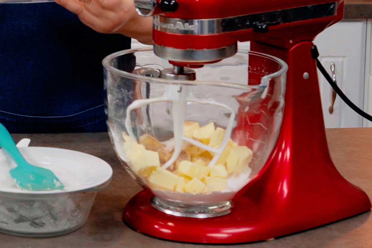 2. Între timp, pus în castronul mixerului zahărul pudră, untul moale, sarea și zahărul vanilat bourbon. Am atașat la mixer accesoriul în formă de K (pentru aluaturi fragede) și am mixat aceste ingrediente până s-a format o cremă omogenă.