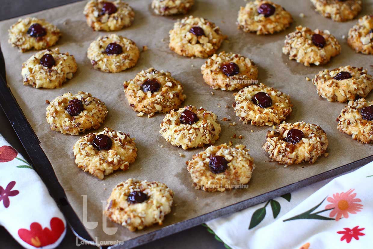 Imediat după coacere, aceste fursecuri cu nucă sunt foarte, foarte fragile. Chiar dacă miros atât de apetisant, nu e cazul să le atingem. Ele trebuie lăsate să se răcească bine, până la temperatura bucătăriei. După răcire, fursecurile sunt fragede în interior iar exteriorul va fi crocant.
