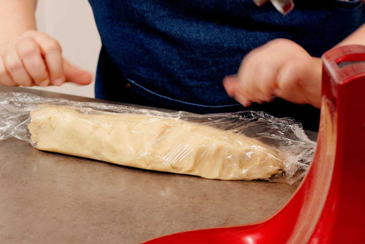 5. Am încorporat cu mixerul făina în compoziția de unt cu gălbenuș, la viteză mică și fără să mixez mai mult decât a fost nevoie pentru a nu mai vedea urme de făină uscată. Mixarea excesivă dezvoltă rețeaua de gluten din făină și produsul ar avea o textură cauciucată. E ultimul lucru pe care îl doresc, pentru aceste fursecuri fine cu nuci. Odată omogenizat aluatul, l-am răsturnat pe o coală de folie alimentară. Am format un baton (cilindru) lunguieț, am înfoliat aluatul și l-am dat la frigider, să se întărească atât cât să devină ușor de modelat.