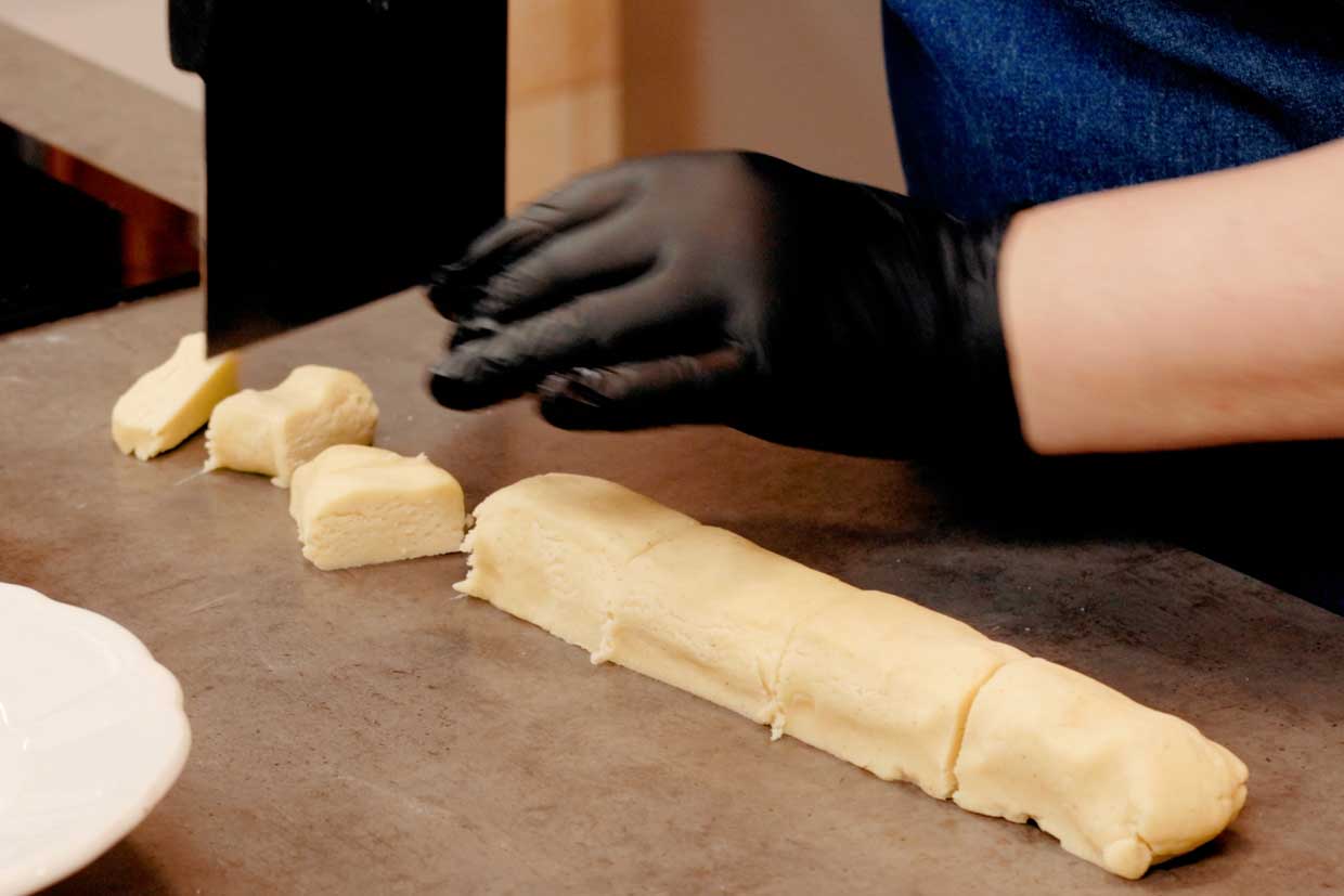 8. După ce aluatul de fursecuri s-a întărit (cam ca plastelina), l-am împărțit în două, pe lungime, apoi fiecare bucată în câte 25 de bucăți egale. În total, am porționat aluatul în 50 de bucăți egale. E important să fie egale, atât pentru aspectul fursecurilor cât și pentru timpul de coacere. Dacă nu puteți face asta din ochi, e mai bine să cântăriți aluatul.