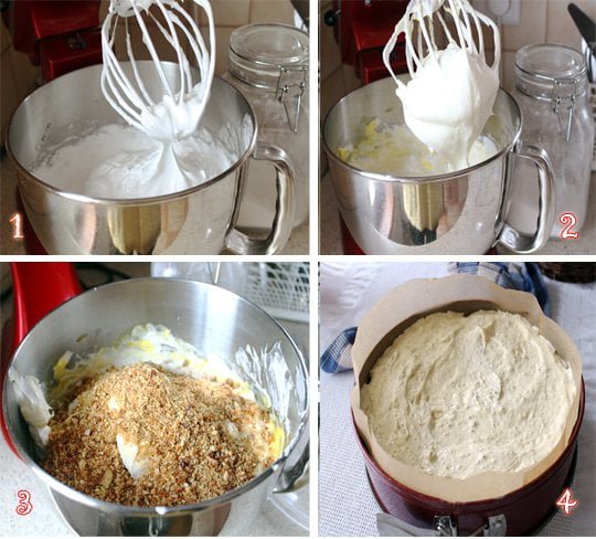 Pentru pregatirea blatului, se separa ouale si se pun intr-un bol incapator albusurile (8 la numar) si apa rece (4 linguri). Se bat spuma albusurile cu sarea si se adauga treptat cele 10 linguri de zahar si zaharul vanilat, batand in continuare la viteza mare pana ce se dizolva zaharul complet (poza 1). Se adauga galbenusurile si se mixeaza scurt de cateva ori (poza 2). Se adauga faina, pesmetul si jumatatea fin macinata din griliaj (poza 3). Se amesteca cu grija, cu ajutorul unei spatule, cu miscari de jos in sus, asa incat aerul acumulat in albusuri sa nu se piarda. Se toarna compozitia in forma de tort unsa si tapetata cu faina sau captusita cu hartie de copt (poza 4).
