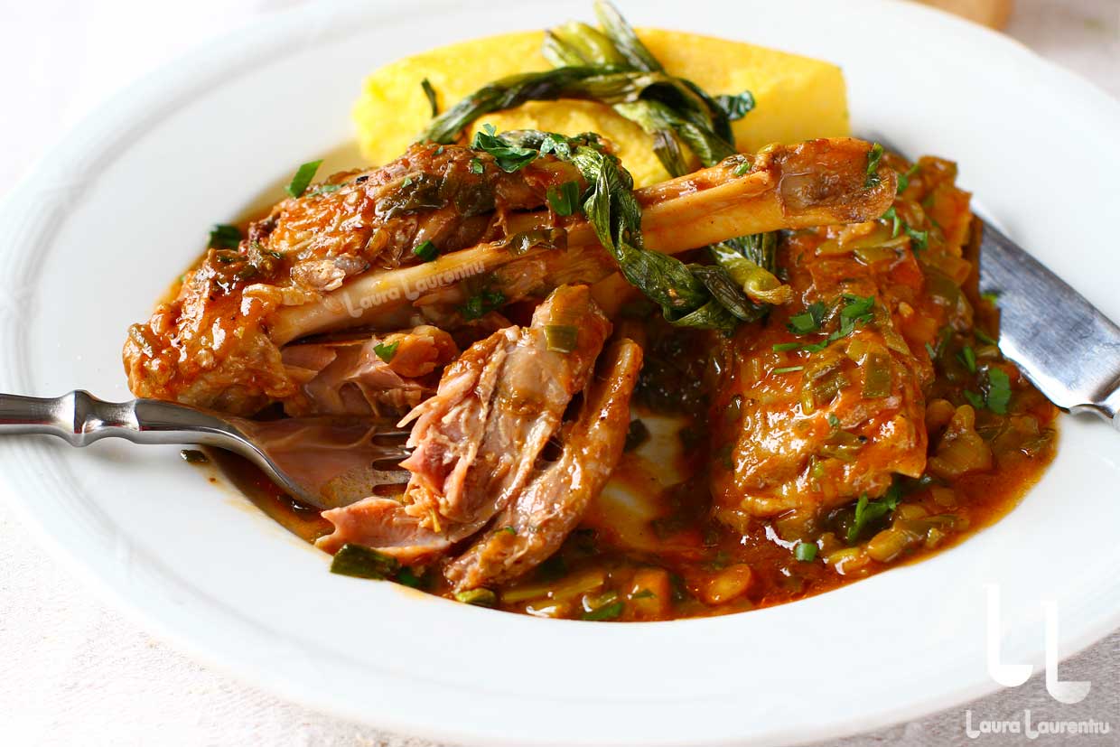 7. După ce vinul s-a evaporat, se adaugă piureul de roșii. Se lasă mâncarea să dea într-un clocot bun apoi se oprește focul. Se adaugă frunzele de ceapă păstrate deoparte și se asezonează sosul după gust cu sare și piper.