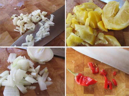 Se curata si se toaca marunt usutroiul (poza 1); se limpezeste o lamaie murata si se taie marunt (poza 2); se toaca o ceapa, fara a fi nevoie sa se toace prea marunt (poza 3); se toaca si ardeiul iute (poza 4).