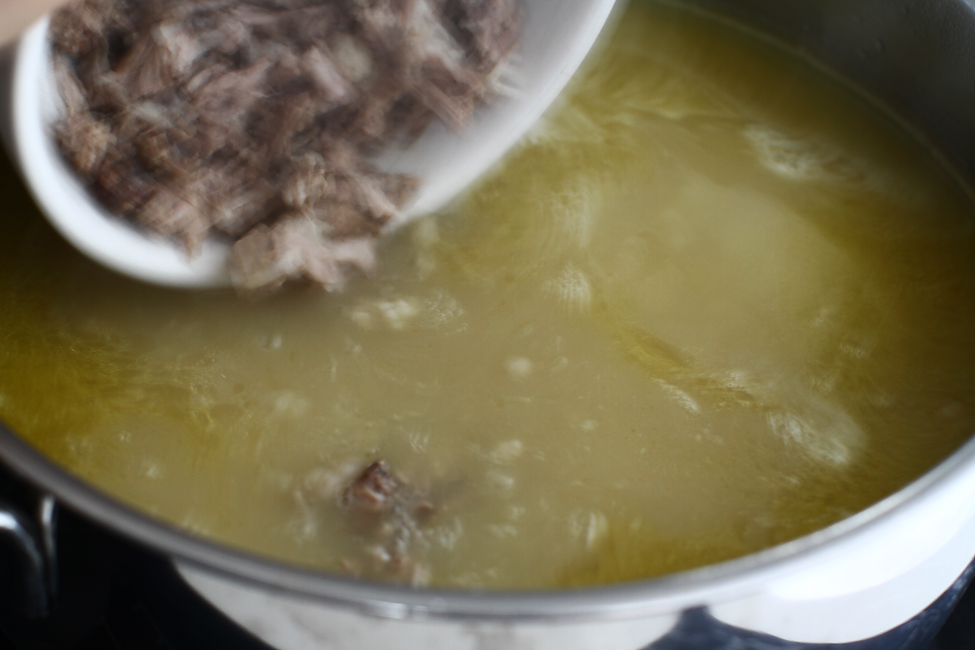 5. Deîndată ce amestecul din oală începe să miroasă ușor a plăcintă coaptă, se adaugă supa fierbinte de miel, câte un polonic odată, amestecând viguros după fiecare nouă tranșă de lichid. După ce toată supa a fost adăugată, se dă într-un clocot, se adaugă carnea porționată în bucăți mici și se asezonează zeama cu sare după gust. Se reduce focul, se adaugă și coaja de lămâie – dacă se folosește – și se fierbe în continuare la foc mic, încă vreo 5-10 minute, până pregătim cele necesare pentru dres.