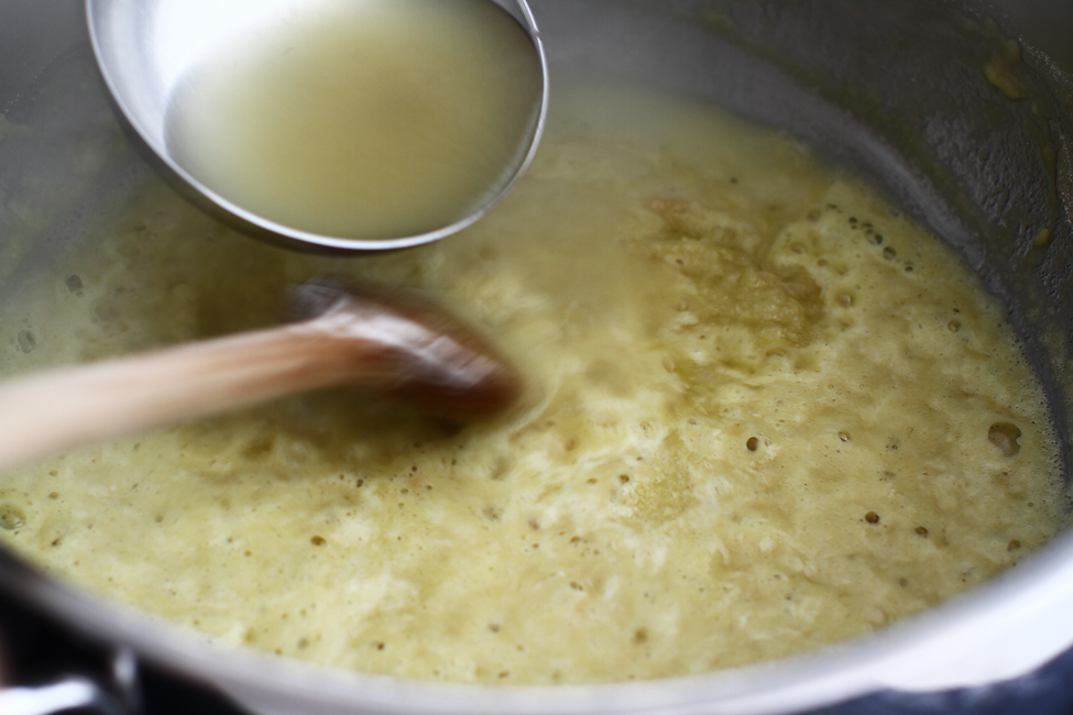 4. Într-o oală potrivită, se pune 1 linguriță de ulei de măsline și se încinge pe foc mediu. Se adaugă 75 de grame de unt. Când untul se topește, se adaugă făina și se amestecă rapid. Preparăm o bază de îngroșare a supei care apare și în gastronomia franceză sub denumirea de roux, menționat și de Larousse Gastronomique.